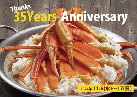 周年記念として、2024年11月6日(水)~17日(日)までの期間、大和店・東戸塚店の2店舗限定でお祝いにもぴったりな人気メニュー「ズワイガニ(300g)」を価格はそのままで倍量の600gにてご提供いたします。