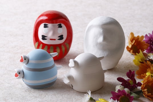 土鈴の音は魔除けの力を持つといわれ、福を招くお守りとしても飾られてきました。1年を平穏無事に過ごせるよう願いを込めて、素焼きの真っ白な土鈴やダルマにお好きに絵付を行います。