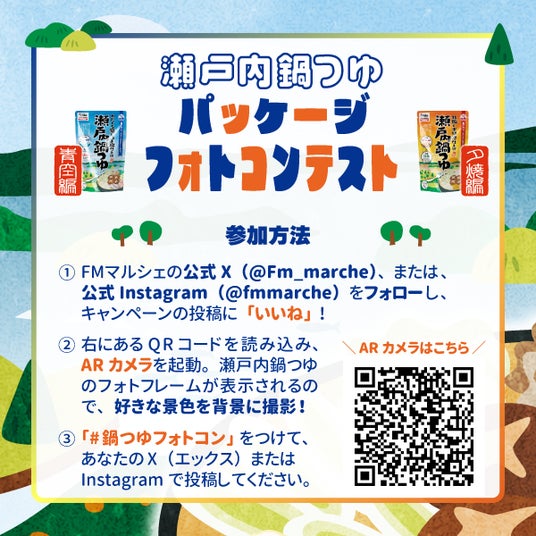同キャンペーンでは、同商品の特徴の1つでもあるパッケージにフォーカスを当て、対象商品である「かたくち鰯とうま塩仕上げ」の“青空”と、「牡蠣と米味噌仕上げ」の“夕焼け”の実際の空を自由に撮影し、瀬戸内鍋つゆのロゴをカメラの画面上で重ね合わせ、自身のSNSへ投稿いただきます。素敵なオリジナルパッケージ写真を投稿いただいた方の中から優秀な作品をFMマルシェで決定し、瀬戸内鍋つゆ“青空編”と“夕焼編”のセットをプレゼントします。