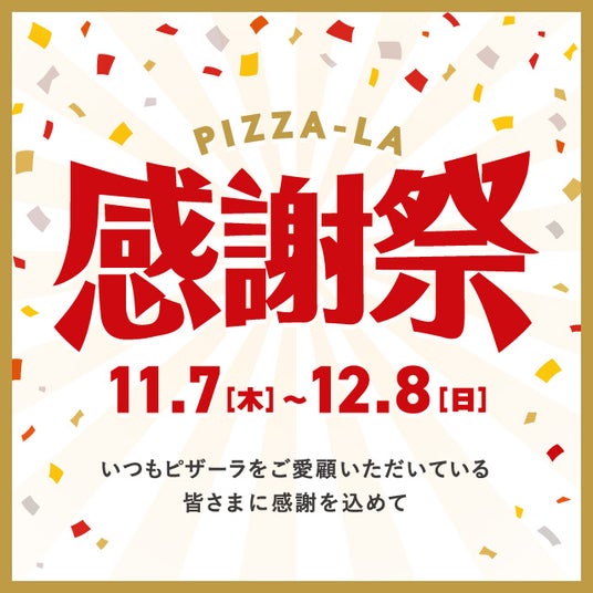 株式会社フォーシーズ(本社:東京都港区南青山 代表取締役会長兼CEO:淺野幸子)が展開する宅配ピザ「PIZZA-LA」は、日ごろのご愛顧に感謝して『ピザーラ感謝祭』を11月7日から実施いたします。