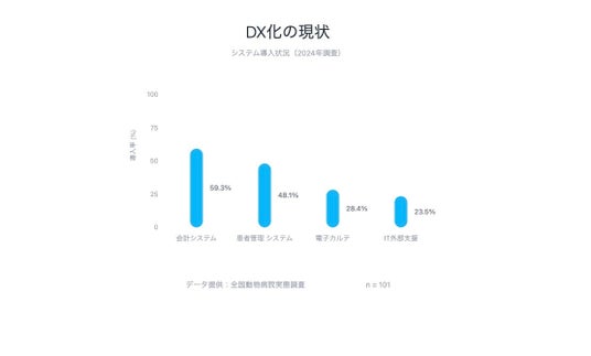 一方で、クリニック支援会社が増加しているにも関わらず、85.2%の施設が外部の人材サポートサービスを未活用であることも判明。また、動物病院のDX化の遅れも課題として浮かび上がりました。会計システムの導入率は59.3%、電子カルテの導入率は28.4%、患者管理システムの導入率は48.1%にとどまっています。さらに、ITシステムの外部支援サービスの利用率が23.5%に留まり、70.4%のクリニックが外部IT支援を受けられていない状況が明らかになっています。