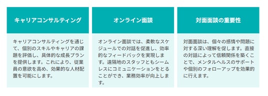 3.キャリアコンサル:離職防止だけでなく成長にもつながるよう、1人1人の 適正や才能、強みを見極める。