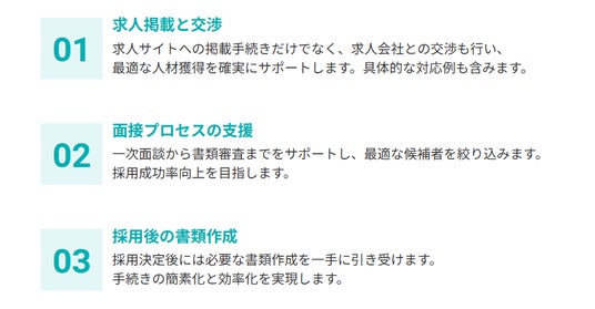 1.採用:求人から採用後の契約周りまでの採用プロセスを完全サポートし、クリニックの負担を軽減。
