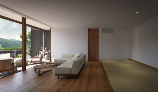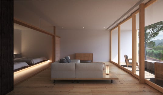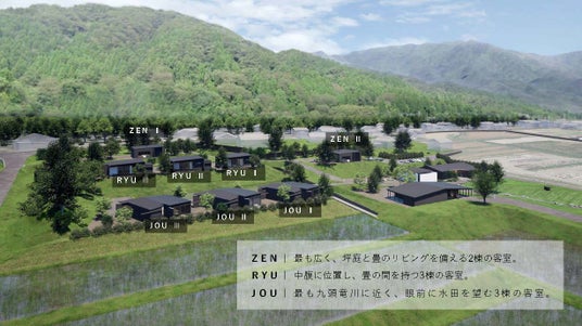 客室の監修・アートキュレーションは、陶芸家・造形作家の内田鋼一氏、バーエリアのデザイン監修を橋本夕紀夫デザインスタジオが担当、家具は、ザ・コンランショップがセレクトしています。越前焼や越前塗など福井を代表する古美術から近現代アーティストの作品、世界各地の民芸品まで古今東西の上質なアートに囲まれた3タイプ全8棟のヴィラは、全室に半露天風呂を完備しております。部屋の名前は、永平寺や九頭竜川、お酒のイメージから、禅=ZEN、竜=RYU、醸=JOUと命名しました。