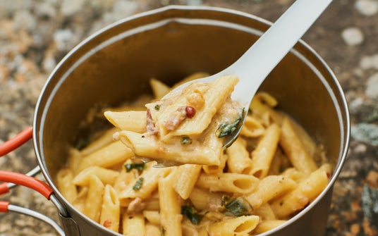 山で食べる塩辛クリームの濃厚な熱々ペンネ。