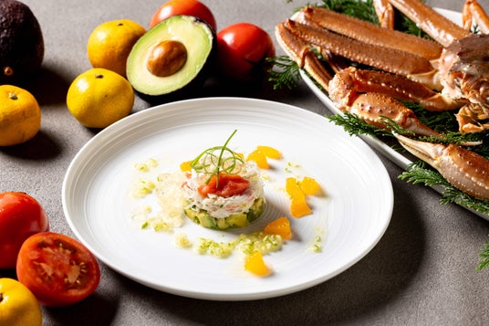 ズワイガニ、冬柑、トマトウォーターのジュレ、アボカド