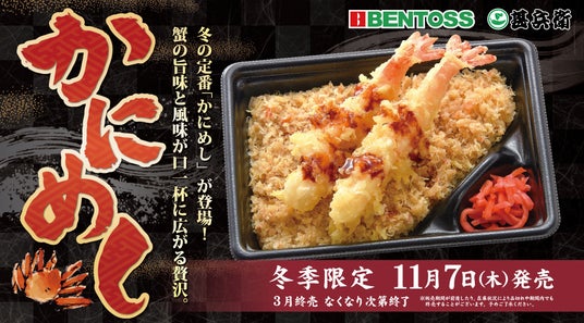 北海道のお持ち帰り弁当チェーン店「BENTOSS」「甚兵衛」では、11月7日(木)より冬季限定商品「かにめし」の販売を開始いたします。蟹の旨味と風味が口いっぱいに広がる贅沢な味わいを、ぜひご賞味ください。