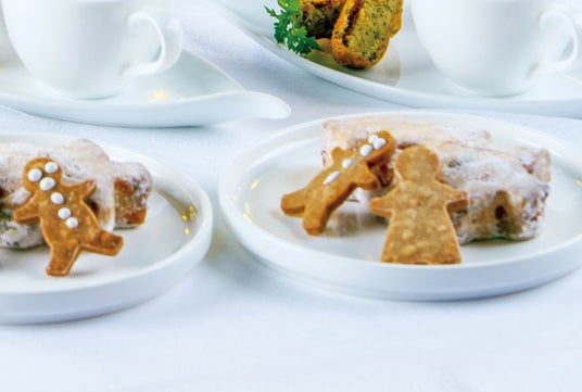 12月限定のアフタヌーンティーは、クリスマス気分を盛り上げる世界のスイーツを楽しんでいただけます。「グリューワインのジュレと赤い果実のベリーニ」は、クリスマスマーケットでお馴染みのスパイス香るグリューワインをゼリーにアレンジした一品。クリスマスケーキの定番・ブッシュドノエルは、濃厚なマロンにカシスの爽やかさを加えた大人な味わいが楽しめます。また、レーズンやオレンジなどのドライフルーツやアーモンドを練り込み風味豊かに仕上げた「シュトレン風スコーン」「ミニクグロフ」「ジンジャークッキー」などの伝統菓子も登場します。