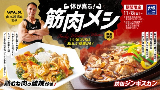 株式会社大戸屋(本社:神奈川県横浜市 代表:蔵人賢樹、以下大戸屋)は、2024年11月8日(金)~2024年11月29日(金)の期間中、VALXを監修する筋トレ界のレジェンド山本義徳氏と共同開発したコラボメニュー2商品を販売いたします。
