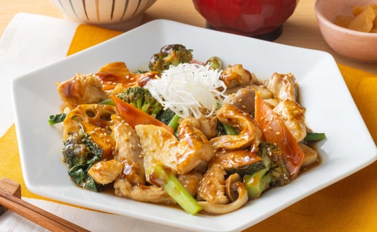 皮を取り除いた鶏むね肉をしっとり柔らかく仕上げ、たっぷりの緑黄色野菜と組み合わせました。ピリ辛で酸味の効いたタレには、旨味を引き出す椎茸エキスをプラス。栄養バランスが良く、ご飯もすすむ満足感ある一品です。