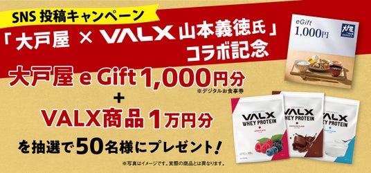 山本義徳氏とのコラボメニュー販売を記念して、「大戸屋eギフト1,000円分」+「お好きなVALX商品」が抽選で50名様に当たるSNS投稿キャンペーンを実施します!1.注文したコラボメニューの写真を撮って、2.ハッシュタグ「#VALX大戸屋コラボ」をつけてSNS(Instagram,X)に投稿するだけ!