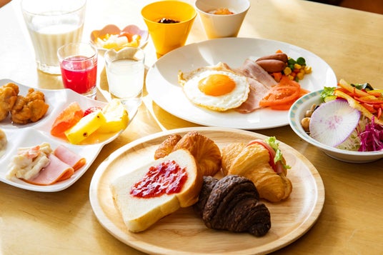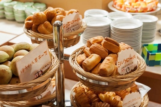 鉄板コーナーでの目玉焼き、小岩井の牛乳、自家製のお豆腐、岩泉産の生乳100%ヨーグルト、館内のパン工房で焼いているパンなどをお楽しみください