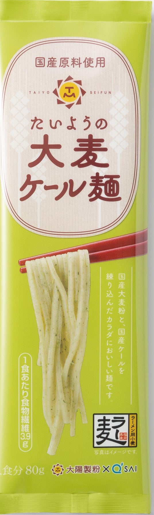 「たいようの大麦ケール麺」は九州産の大麦を使用、1食80g当たりの食物繊維量は3.9g、現代人の足りない食物繊維を補います。