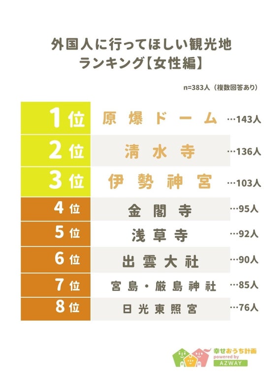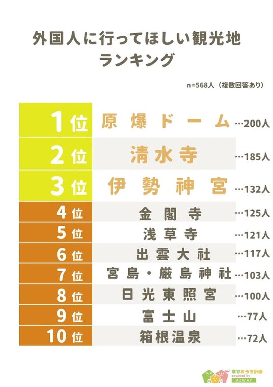 今回、株式会社AZWAY(https://azway.co.jp/)が運営する、幸せおうち計画(https://azway.co.jp/media/)は、10代から60代以上までの568人を対象に「外国人に行ってほしい観光地ランキング」についてアンケート調査を実施しました。