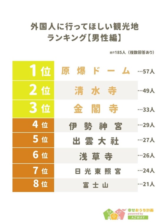 続いて、性別ごとに「外国人に行ってほしい観光地」をランキング化したところ、女性の場合は1位が「原爆ドーム」、2位が「清水寺」、3位が「伊勢神宮」という結果になりました。2位以降は全て、神社やお寺であることがわかります。