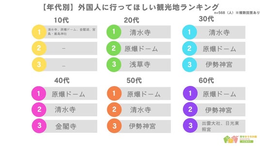 最後に、年代別にランキングを見たところ、どの年代でも上位2位以内に「原爆ドーム」が入っていることがわかりました。また、60代以上では京都以外の神社仏閣がランクイン。金閣寺や清水寺はランク外となっており、年代によっておすすめしたい場所の好みがわかれることもわかりました。