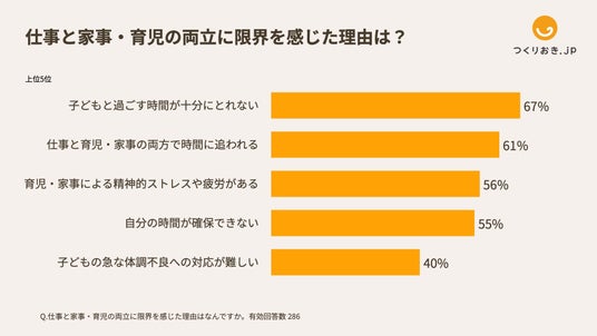 その主な理由を見てみると、「子どもと過ごす時間が十分にとれない」(67%)、「仕事と育児・家事の両方で時間に追われる」(61%)、「自分の時間が確保できない」(55%)など、時間的な余裕の不足が際立っています。