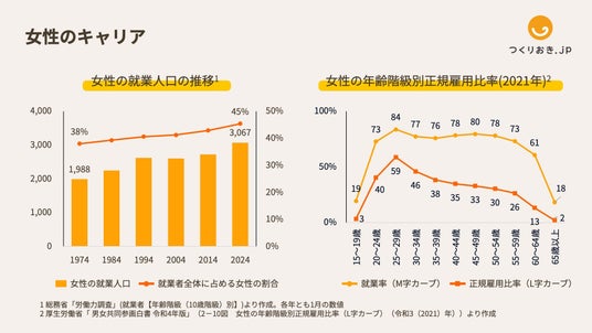 女性の就業者数は増加傾向にある一方で、正規雇用の比率は20代後半をピークに出産や育児を機に低下する「L字カーブ」現象が見られます。仕事と育児の両立が難しく、子どもを持つためにはキャリアを諦めざるを得ないという状況にあります。