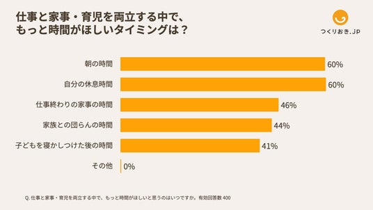 仕事と家事・育児を両立するなかで、もっと時間がほしいと感じるタイミングについて尋ねたところ、「朝の時間」と「自分の休息時間」が同率1位で、それぞれ60%に上りました。