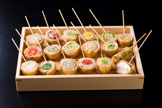 いろどり串揚げ肉とお野菜を一緒に召し上がれるひと口サイズのピンチョススタイルで提供する見た目もおいしい串揚げです。細かい衣を使用することで素材を引き立て、ワインとの相性も抜群です。