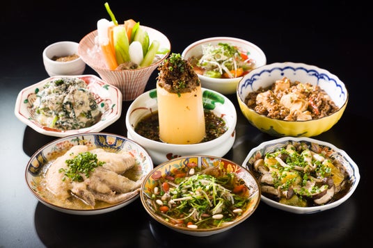 白ポン酢、焼き麦味噌、くるみ胡麻など、そば猪口に用意されたたれとお出汁を混ぜ合わせながらしっかり絡めて、ざるそばのようにそれぞれの部位の特徴を味わいください。さらに味変として赤もみじおろし、青もみじおろし、柚子胡椒、薬膳薬味を加えながら飽きずにお召し上がりいただけます。