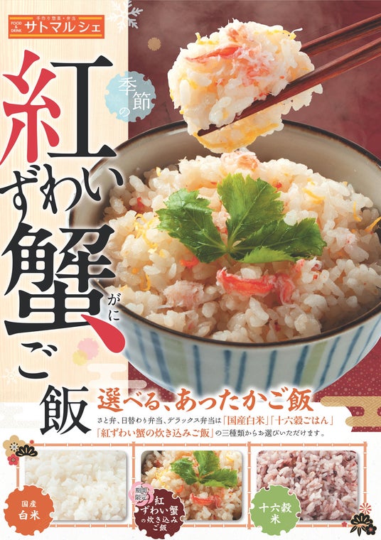 11/12(火)~2024年1月中旬までの期間限定で、季節のごはんとして「紅ずわい蟹ご飯」が登場します。紅ずわい蟹と錦糸玉子を炊き込んだ、蟹の旨味と玉子の優しい甘さが相性抜群の炊き込みごはんです。100g当たり税込216円で単品販売する他、「さと弁」「日替わり弁当」「デラックス弁当」のごはんとしてもお選びいただけます。
