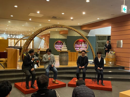 セレモニーでは、岩崎醸造の白石壮真氏、マンズワインの向山功一氏、白百合醸造の秋葉良子氏とリゾナーレ八ヶ岳総支配人の高橋伶央でトークセッションを開催。各ワイナリーはワイン造りへの想いやこだわり、葡萄の収穫状況や今年の山梨ヌーボーの味わいについて語りました。今年は例年より気温が高い日が多く、台風の影響で湿度も高い年であったと振り返りながらも、岩崎醸造の白石壮真氏は「暑さは豪快な色、柔らかい酸味と豊満なボディをワインに与えた印象」、マンズワインの向山功一氏は「高温が続く難しい年であったものの、マスカット・ベーリーAは華やかな香りにやわらかなタンニンと果実味が感じられる仕上がりになった」、白百合醸造の秋葉良子氏は「ヌーボー用の葡萄の収穫時期を見極め、フレッシュでバランスの良い酸味が感じられ、飲み心地の良い仕上がりになった」と語りました。