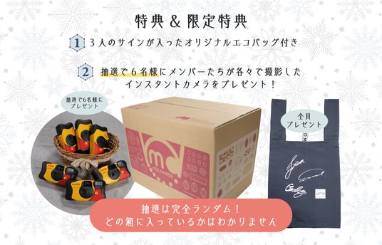福箱を購入いただいたお客様を対象に、LAST FIRSTメンバーが書いた「LAST FIRST」のロゴとサインがプリントされたオリジナルエコバッグがついてきます。さらに抽選で6名様に、メンバーそれぞれがプライベートも含めて自由に撮影していただいたインスタントカメラをプレゼントいたします。現像するまでは、どんなショットが撮影されているかわからない、お楽しみ感いっぱいのカメラです。