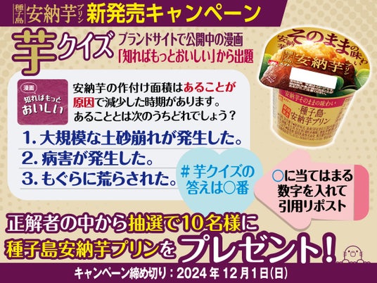 ブランドサイトで公開中の漫画「知ればもっとおいしい」を読んで、協同乳業公式Xで出題する芋クイズに引用リポストで回答すると、正解者の中から抽選で10名様に種子島安納芋プリン(8個入り)をプレゼントするキャンペーンを実施いたします。