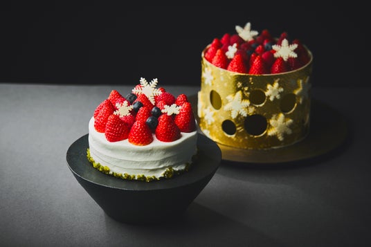 聖夜にこの上ない幸せ(Blissful)を願ってシェフがデザインしたクリスマスケーキは、大阪ステーションホテルのブランドカラーであるゴールド。パーティーの主役にふさわしい輝きを放っています。トップにたっぷりのいちごとブルーベリーやラズベリーをあしらい、側面はホワイトチョコレートにぐるりと金箔を飾りました。ところどころに開いたホールから中を覗くと、そこにはさらに、いちごとクリームをたっぷり使った、王道のショートケーキが出番を待っています。