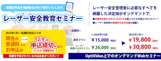このたび、提供するコンテンツのさらなる充実とサポート体制の改善に対応し、より高品質なサービスを継続的にご提供するために価格改定を実施させて頂くことにいたしました。レーザー技術の進展に合わせ、最新の安全対策や事例を盛り込んだ講義内容の充実化を図り、受講者の皆様が実務に役立つ知識をより深く学べる環境を整えてまいります。