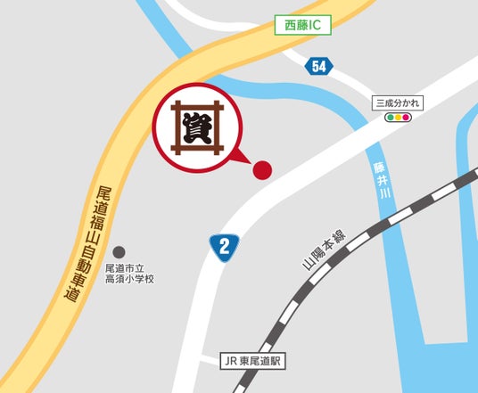 「資さんうどん尾道高須店」は「JR東尾道駅」から車で約5分。国道2号線沿いで、山陽自動車道福山西ICからも車で約20分ほど場所に位置します。様々な用途で便利にご活用いただけます。
