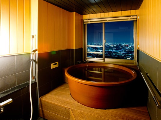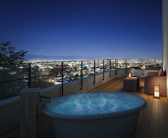 ■露天風呂付和モダン広々とした45平方メートル の空間に27平方メートル の露天風呂を含むテラスが備わっています。建物の角部屋に位置しているためテラスからは大阪の街並みと箕面の自然、どちらもお楽しみいただけます。
