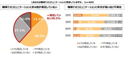 職場のコミュニケーションへの満足度について、約4割(38.5%)が「あまり満足していない(27.1%)」「全く満足していない(11.4%)」と回答しました。「20代(28.4%)」「30代(36.6%)」「40代(43.3%)」「50代(46.6%)」と年次が上がるほど、職場のコミュニケーションに満足していない傾向が見られました。