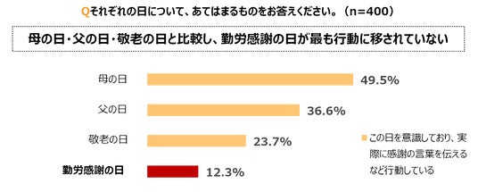 誰かに感謝や労いの気持ちを伝える日である、母の日・父の日・敬老の日・勤労感謝の日について、それぞれへの意識を聞いたところ、「この日を意識しており、実際に感謝の言葉を伝えるなど行動している」と回答した人は、「母の日(49.5%)」、「父の日(36.6%)」、「敬老の日(23.7%)」、「勤労感謝の日(12.3%)」となり、勤労感謝の日が最も行動に移されていないことがわかりました。