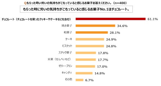 また、もらった時に労いの気持ちがこもっていると感じるお菓子の種類を聞いたところ、チョコレート(61.1%)が最多となりました。続いて「焼き菓子(34.6%)」「和菓子(28.1%)」という結果になりました。