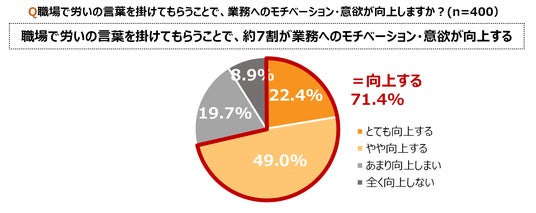 一方、職場で労いの言葉を掛けてもらうことで、業務へのモチベーション・意欲が向上するか聞いたところ、約7割(71.4%)が「とても向上する(22.4%)」「やや向上する(49.0%)」と回答しました。