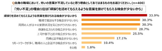 また、自身の職場において、日常的に労いの言葉が不足していると思うか聞いたところ、2人に1人(50.5%)が「とても思う(16.2%)」、「やや思う(34.3%)」と回答しました。「労い不足」の理由TOP3は、「頑張りを認めてもらえるような言葉を掛けられる機会が少ないから(33.9%)」、「職場で雑談をする機会が少ないから(30.3%)」、「周囲の人が日々の業務状況を気にかけてくれないから(30.3%)」という結果になり、コミュニケーション機会が少ないことだけではなく、労いの言葉を掛けることへの意識が低い様子も伺えました。
