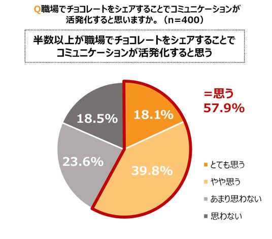 職場でお菓子をシェアする頻度としては、1週間に1回以上シェアしている人は3割未満(28.0%)に留まり、お菓子をシェアする文化のある職場は少ないようですが、職場でチョコレートをシェアすることでコミュニケーションが活発化すると思うか聞いたところ、半数以上(57.9%)が 「とても思う(18.1%)」「やや思う(39.8%)」と回答しました。