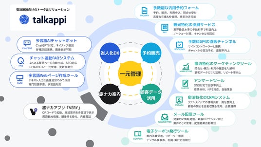 「talkappi」は、観光分野に特化したAI活用の顧客体験プラットフォームで、観光・宿泊施設にトータルソリューションを提供いたします。日本語、英語・中国語(簡体字・繁体字)・韓国語を含む最大134言語に対応し、日本の代表的なホテルや旅館・観光自治体・観光体験事業者が多く利用しています。