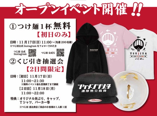 オープン初日の11月17日(日)は、先着200名様に「つじ田」の看板メニューである「濃厚つけ麺」を無料でご提供するオープンイベントを実施。また、11月17日(日)、18日(月)の2日間限定で「つじ田」オリジナルグッズが当たるくじ引き大会や、お並びのお客様にビールやソフトドリンクを振る舞います。
