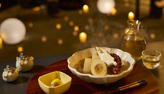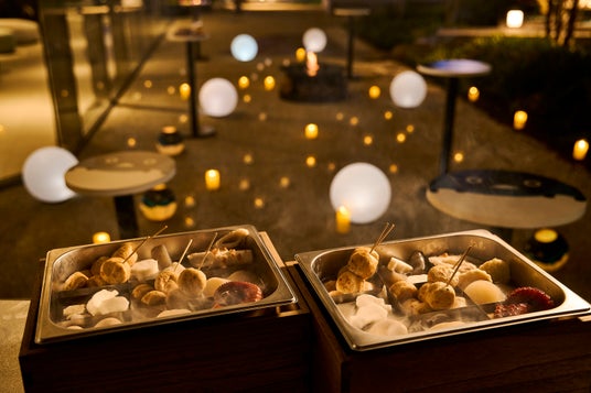 みやぐりんには、ふぐだしで煮込んだふぐおでんや、だし割りを提供する、ふぐスタンドが登場します。ふぐおでんのメニューには、大根やこんにゃくといった定番の具材に加え、ふぐの練り物を使用したふぐ型のはんぺんも用意。薬味としてふぐ味噌やからしを添えて、味の変化も楽しめます。だし割りは、ふぐおでんの旨味が溶け出しただしと、日本酒との相性が抜群。体の芯から温まることができます。また、キャンドルライトで彩られたふぐスタンドの周辺には、焚火やふぐのイラストが施されたハイテーブルを用意。キャンドルライトの灯りと焚火の炎が織りなす幻想的な空間で、ふぐ尽くしの特別なひとときを過ごせます。