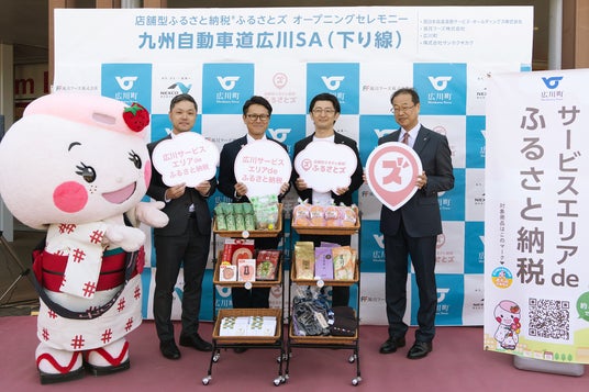 福岡県広川町(町長:氷室健太郎)と風月フーズ株式会社(福岡市南区、代表取締役社長:福山剛一郎)、西日本高速道路サービス・ホールディングス株式会社(大阪市北区、代表取締役社長:川村 健一)、株式会社サンカクキカク(久留米市、代表取締役社長:宇佐川桂吾)、は、広川サービスエリア(SA)(下り線:熊本方面)で、九州の高速道路のサービスエリア(SA)・パーキングエリア(PA)で初導入となる、店舗型ふるさと納税『ふるさとズ』(株式会社サンカクキカク 本社:福岡県久留米市)を用いたふるさと納税サービスを、令和6年11月8日(金曜)11 時に開始しました。