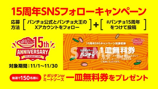 パンチョ15周年の喜びをSNSでみんなで分かち合おう! 15周年SNSフォローキャンペーンも開催中。パンチョ公式Xとパンチョ大王Xアカウントをフォローのうえ「#パンチョ15周年」を付けてXに投稿してください。抽選で150名様にパンチョ一皿無料券をプレゼントします。