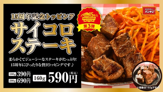 “改めてナポリタンはうまいと言わせたい”を理念に掲げる『スパゲッティーのパンチョ』は2024年11月13日(水)に創業15周年を迎えます。それを記念した創業祭第三弾として15周年記念トッピング「サイコロステーキ」を11月16日(土)より期間限定で販売いたします。