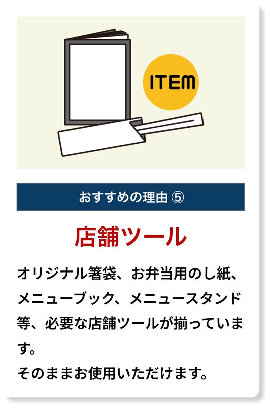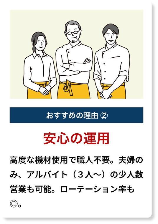 飲食店未経験の方でもおいしく調理できる、高度な機材を使用するオペレーションなので安心。アルバイトのみ等、3人からの少人数営業も可能です。