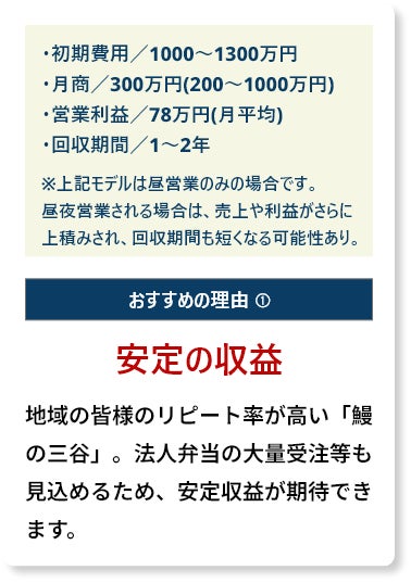 月2回の来店、「昼食で立ち寄り、週末にも家族で再来店」等、リピート率の高さも鰻の三谷ならでは。法人弁当の大量受注等も見込めるため安定収益が期待できます。