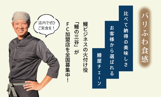 「自分の幸せも周りの幸せも、あなたの満たされた気持ちで大きく変わる!」をモットーに、2年で愛媛?香川?岡山?徳島?広島と7店舗まで拡大した「鰻の三谷」を展開する株式会社クイーク(本社:高知県高知市 代表:三谷昌平)が、フランチャイズ加盟オーナーを全国で募集します。新規事業をお考えの方、安定的なFC事業をお探しの方、FC初心者等、幅広くFCオーナーを募集!