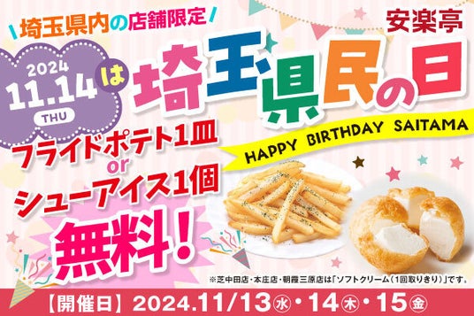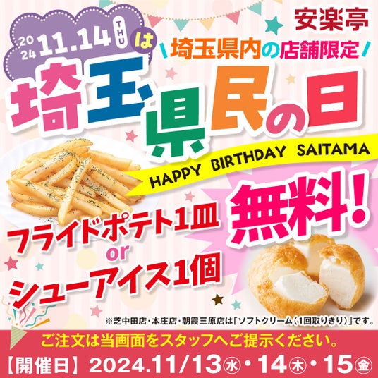 ※埼玉県内の安楽亭店舗59店舗が対象です(対象店舗についてはhttps://anrakutei.jp/fair/saitamacitizensday/でご確認ください)。