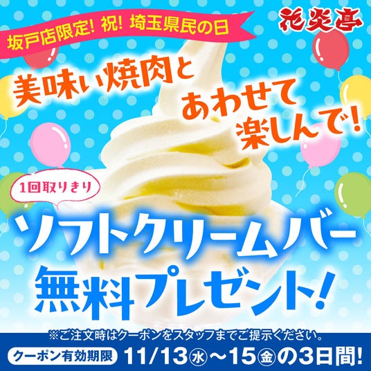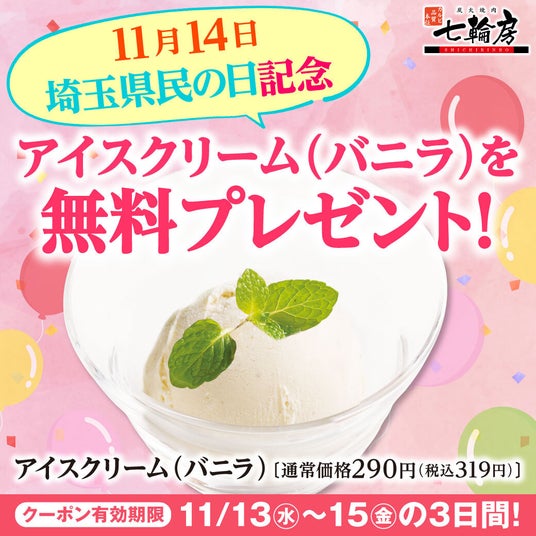 「焼肉レストラン安楽亭」「炭火焼肉 七輪房」「花炎亭」ではこの日、ご来店のお客様にささやかなプレゼントをご用意して、スタッフ一同、お客様といっしょに「埼玉県民の日」を楽しみます。